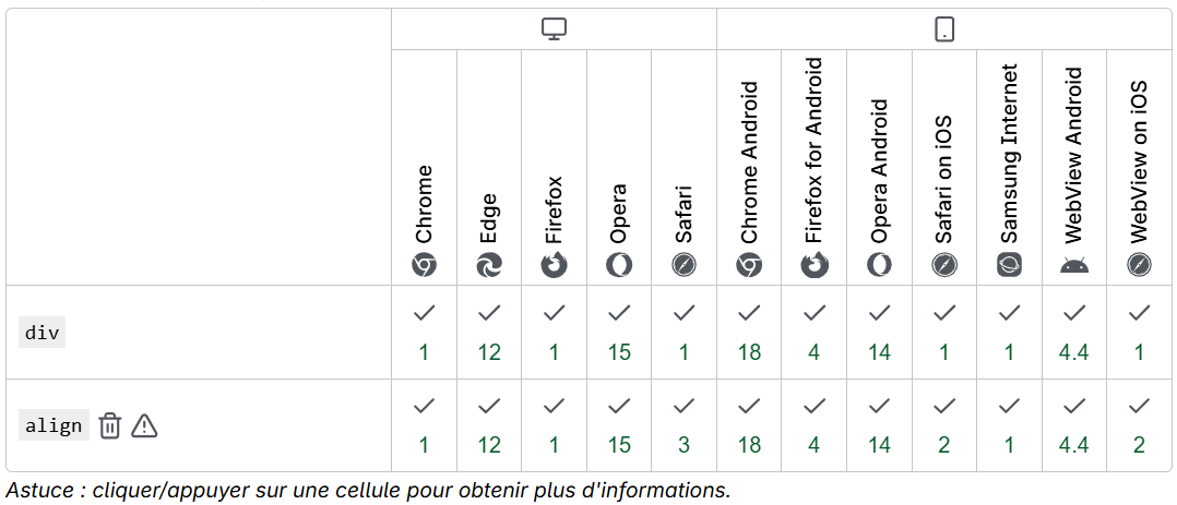 En tant que conteneur « pur », l'élément <div> ne représente rien en soi. Il est plutôt utilisé pour regrouper le contenu afin qu'il puisse être facilement stylé à l'aide des attributs class ou id, pour marquer une section d'un document comme étant écrite dans une langue différente (à l'aide de l'attribut lang), etc.